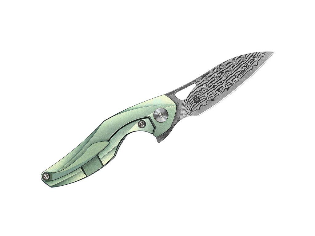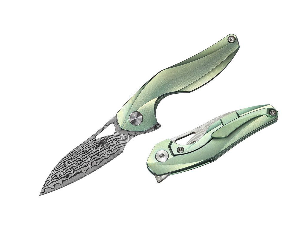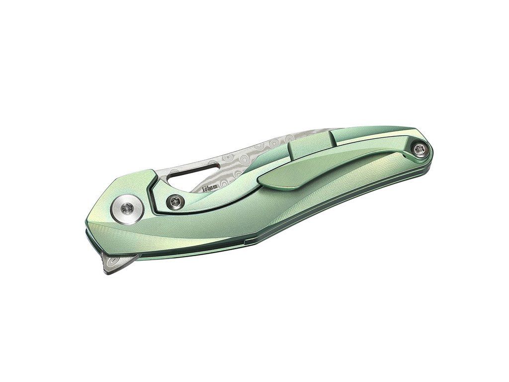 Bestech Reticulan is a small premium folding EDC knife with a unique design created by Elijah Isham. Thanks to its kydex sheath it can be worn around the neck. In terms of construction it is a frame lock flipper with the blade placed on ceramic bearings. The 5.2 cm blade with a drop point shape and satin finish is made of damascus steel with a very nice pattern and hardnesss up to 61 HRC. Both the handle and the clip are made of titanium (grade 5, Ti6Al4V). The handle is made of anodised green coloured titanium.