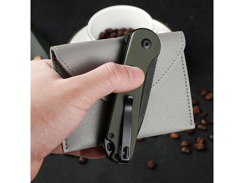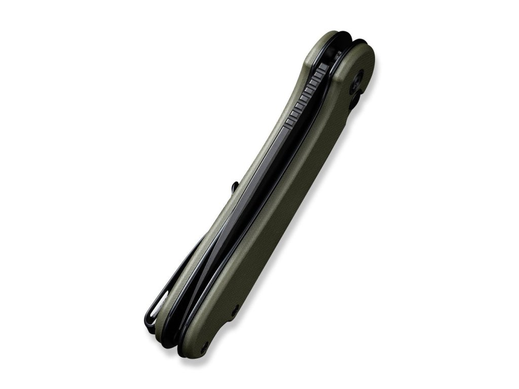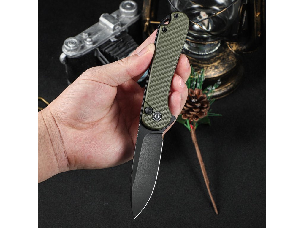 Green G10 handle scales ensures a comfortable grip. Featuring black deep-carry pocket clip and a flipper opening. The blade opens very smoothly thanks to ceramic ball bearings. The knife weighs 88,5 g.