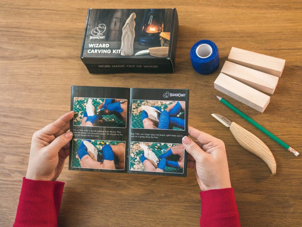 A beginner-friendly wood carving kit that offers fun for kids, adults, and the whole family. This starter set includes the BeaverCraft C2 carving knife, an illustrated guide for making a wizard figure, and three pieces of basswood for carving.